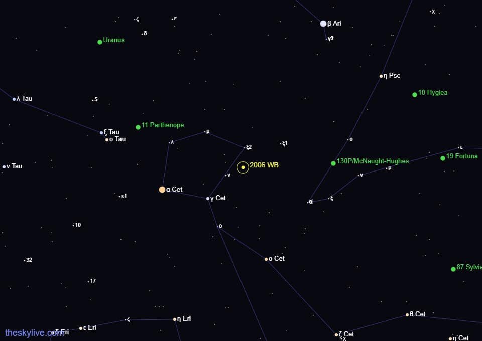 Sky map showing the 2006 WB asteroid in Cetus constellation on Tuesday (26). Credit: Theskylive