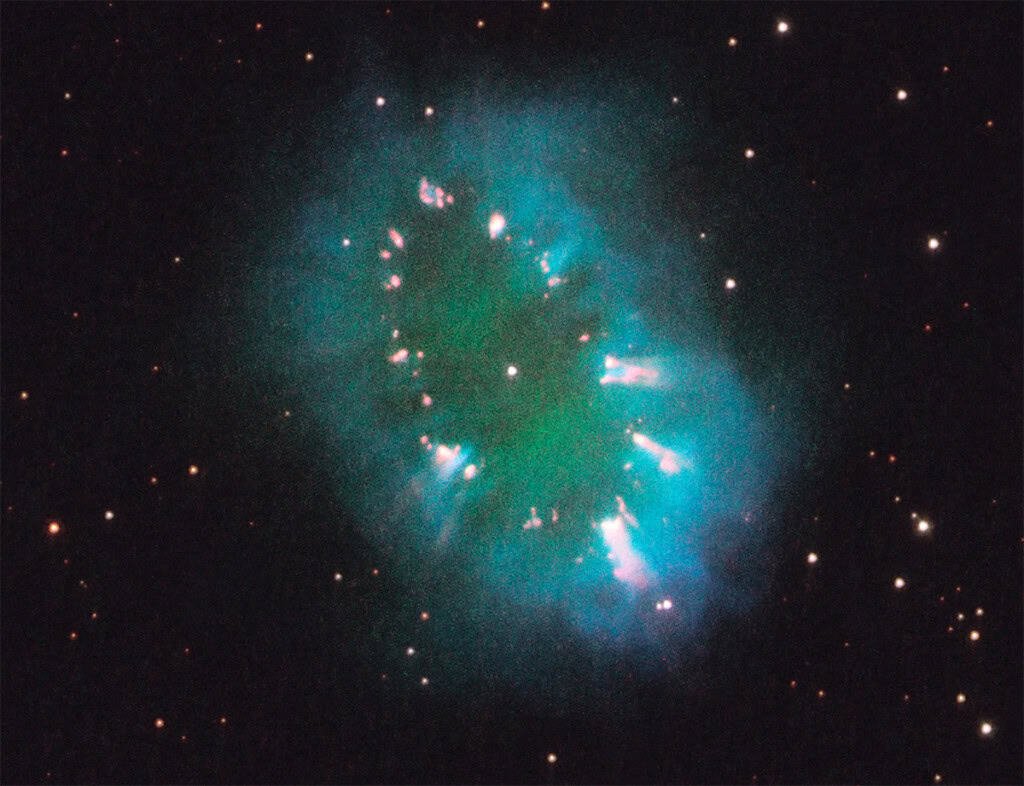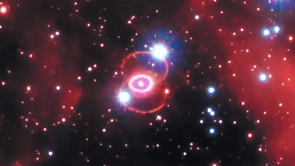 Around it, three mysterious gas rings were formed, which look like floating jewelry in space. The most accepted explanation is that these rings arose when two stars merged before the final explosion. Get more information about this supernova here.