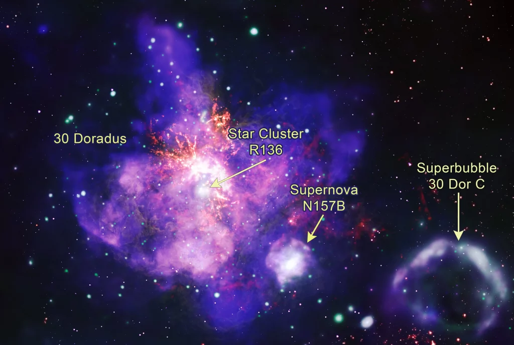 This supernova was the closest and most bright recorded in the last 400 years. It took place in the same galaxy as the Tarantula nebula and was first seen in 1987, bright as 100 million sun.